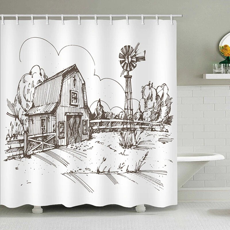 Gi badet ditt en oppgradering med dette sjarmerende dusjforheng med blyanttegning av gård.
