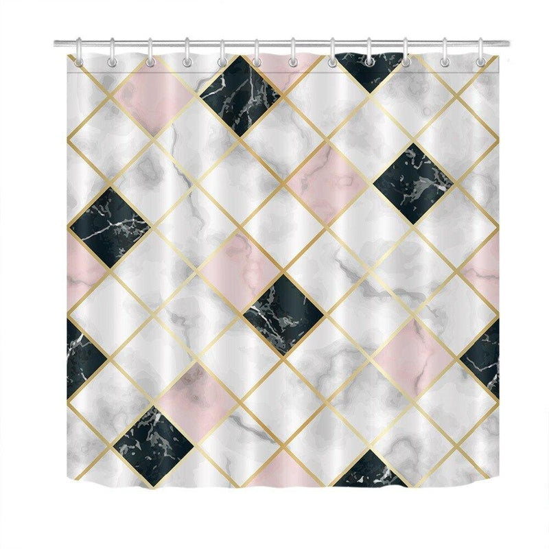 Lei av et kjedelig bad? Dette nydelige dusjforhenget med et geometrisk flismønster er akkurat det du trenger for å puste nytt liv i rommet! Tenk deg å starte dagen med dette elegante designet som kombinerer marmoreffekter i hvitt, rosa og svart, innrammet av stilige gullinjer. Det er mer enn bare et dusjforheng; det er et statement som forvandler et funksjonelt rom til en oase av stil og ro. Perfekt for deg som ønsker et moderne og luksuriøst preg på baderommet uten en totalrenovering. Det er enkelt å installere og vil umiddelbart heve stemningen og gi badet ditt et friskt og innbydende utseende.
